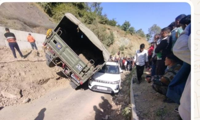 चंपावत: कार के ऊपर पलटा सेना का ट्रक बाल-बाल बचा बड़ा हादसा फिर मलवा बना दुर्घटना का कारण।
