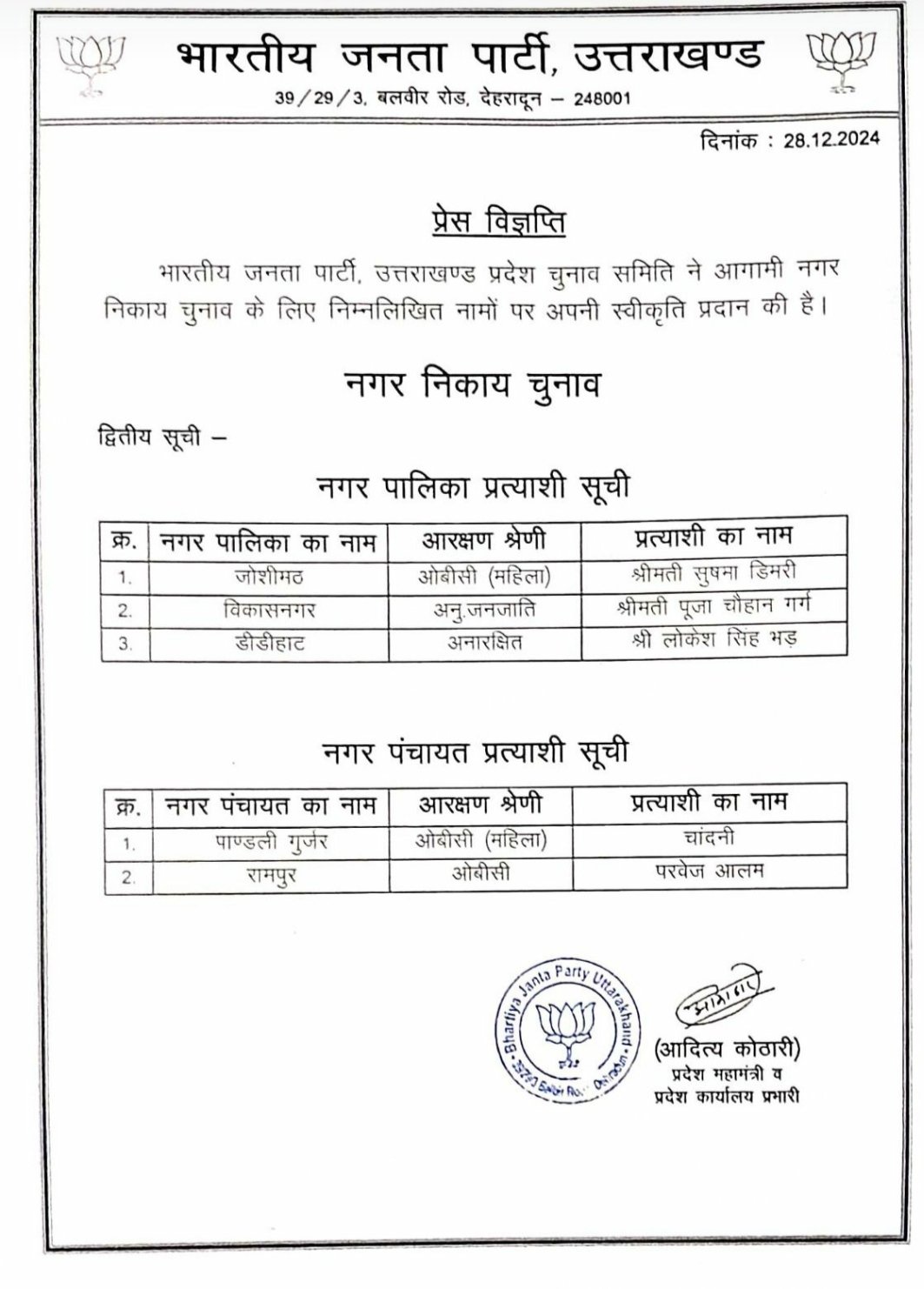 देहरादून: भाजपा ने की नगर पालिका/ पंचायतों की दूसरी सूची जारी।