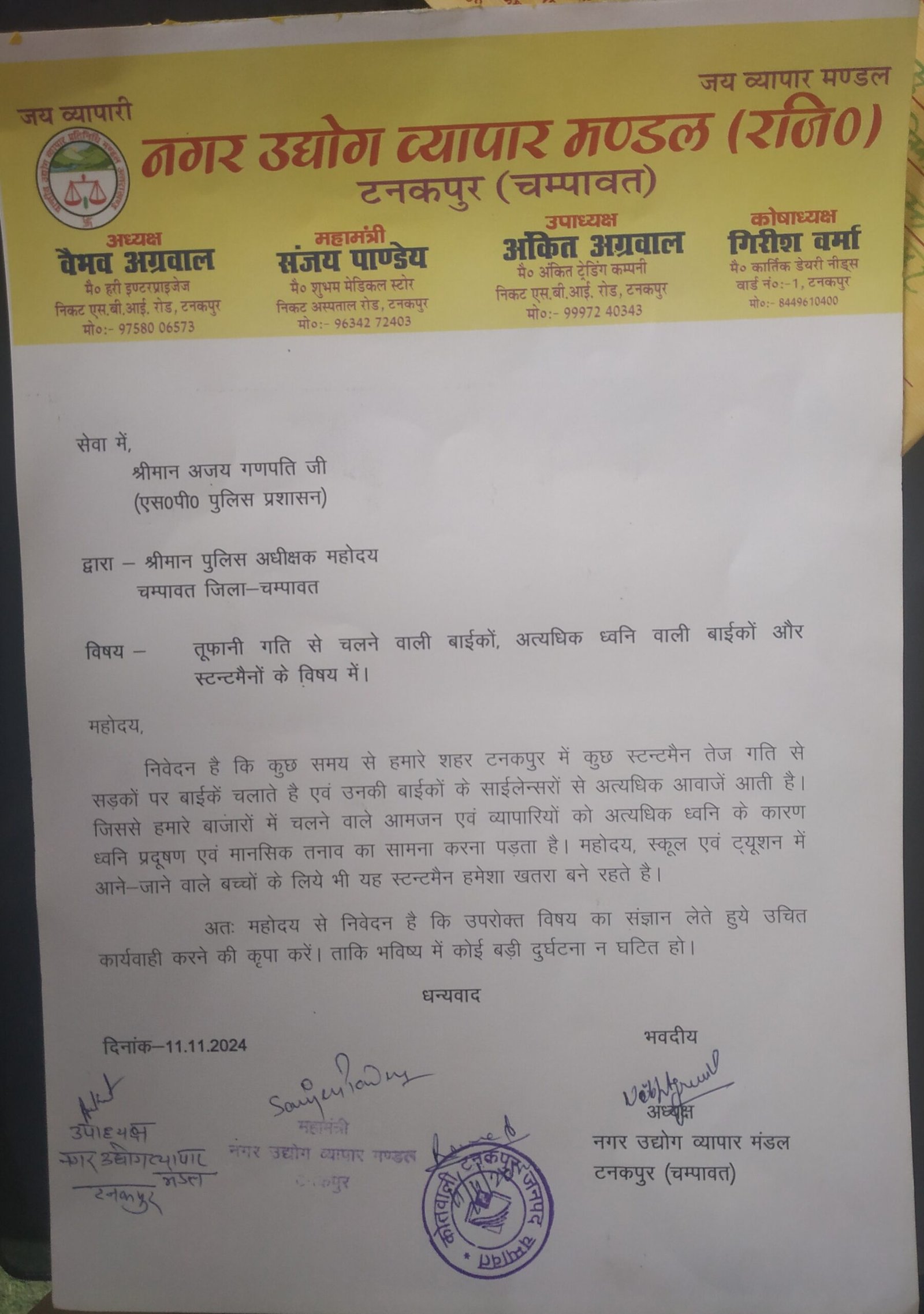 टनकपुर व्यापार मण्डल पदाधिकारियों ने नगर में अनियंत्रित गति से बाइकरों स्टन्टमैनो के खिलाफ कार्यवाही करने को लेकर पुलिस अधीक्षक को भेजा ज्ञापन ।